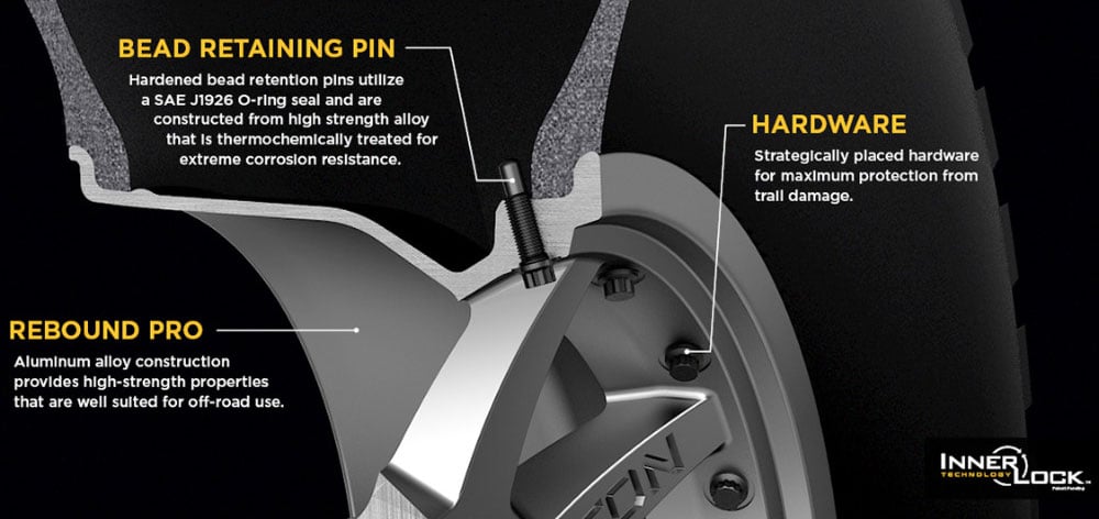 The ICON Alloys RECON PRO with patented "InnerLock Technology" offers the best of both worlds by using a robust bead retention system to keep the tire bead secured to the wheel while also being fully DOT compliant. This provides confidence in knowing that your wheels are prepared to tackle whatever situation you encounter - on or off the beaten path. InnerLock is ready for any type of terrain and every single adventure.